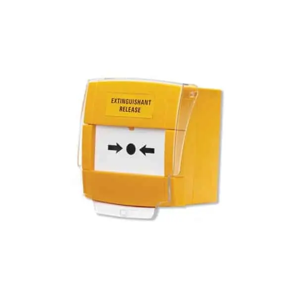 Break Glass, Yellow, surface mounting call point with hinged cover & “Extinguishant Release” text. Model: BF372 (MCP3A-Y000SG-14C)
