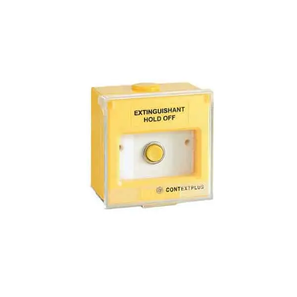 Yellow Extinguishant Hold Off button, surface mounting, with hinged cover & “EXTINGUISHANT HOLD OFF” text